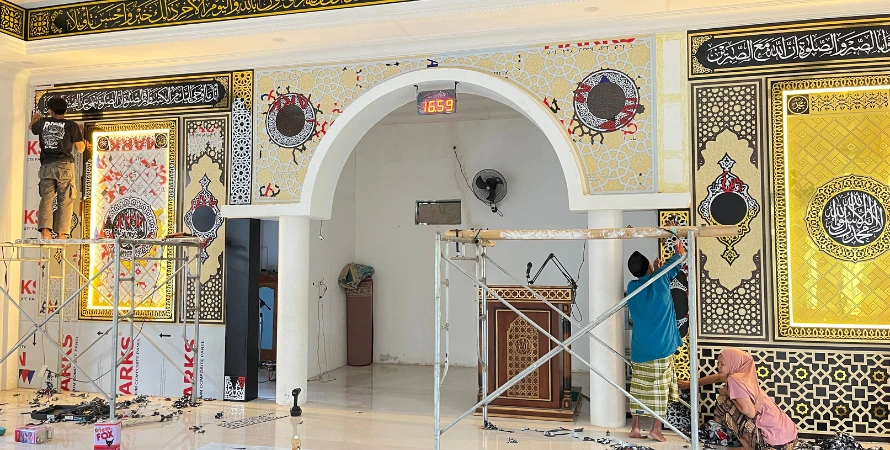Kami menyediakan layanan pembuatan kaligrafi dan ornamen masjid dengan berbagai pilihan material dan desain, disesuaikan dengan konsep bangunan dan kebutuhan pengurus masjid.